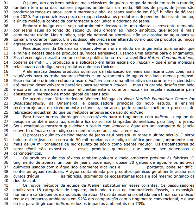 (Disponível em: www.nationalgeographicbrasil.com/meio-ambiente/2024/05/o-jeans-e-ruim-para-o-meioambiente-mas-uma-nova-descoberta-pode-ajudar – texto adaptado especialmente para esta prova).